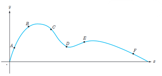 7 نقاط E، D، C، B، A و F را روی منحنی روبه رو در نظر می گیریم. در مورد شیب منحنی در این نقاط کدام گزاره درست و کدام یک نادرست است؟