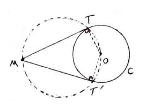 زیرا اگر از T و \(T'\) به O وصل کنیم، زاویه های T و \(T'\) محاطی رو به رو به قطر می باشند، پس \({90^0}\)  می باشند؛ لذا چون MT و \(MT'\) بر شعاع در نقطه T و \(T'\) عمودند، پس MT و \(MT'\) مماس بر دایره می باشند.