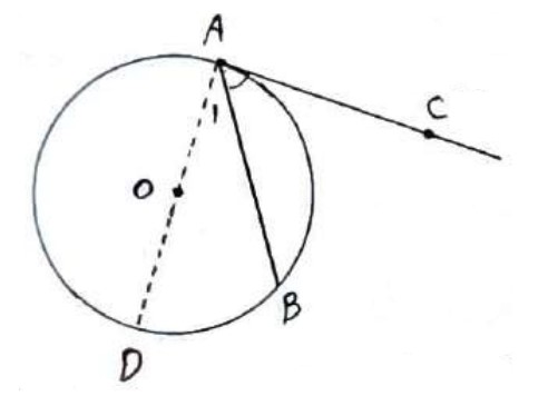 \(\begin{array}{*{20}{l}}{D\hat AC = {{90}^0} \Rightarrow D\hat AC = \frac{{\mathop {AD}\limits^\frown {\mkern 1mu} }}{2}}\\{}\\{{{\hat A}_1} = \frac{{\mathop {BD}\limits^\frown {\mkern 1mu} }}{2}}\\{}\\\begin{array}{l} \Rightarrow D\hat AC - {{\hat A}_1} = \frac{{\mathop {AD}\limits^\frown {\mkern 1mu} - \mathop {BD}\limits^\frown {\mkern 1mu} }}{2}\\\\ \Rightarrow \hat A = \frac{{\mathop {AB}\limits^\frown {\mkern 1mu} }}{2}\end{array}\end{array}\)