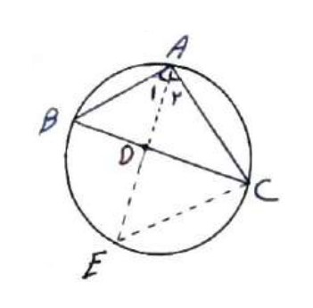 ابتدا دایره محیطی مثلث ABC را رسم می کنیم و نیم ساز AD را امتداد می دهیم تا دایره محیطی را در نقطه E قطع کند.