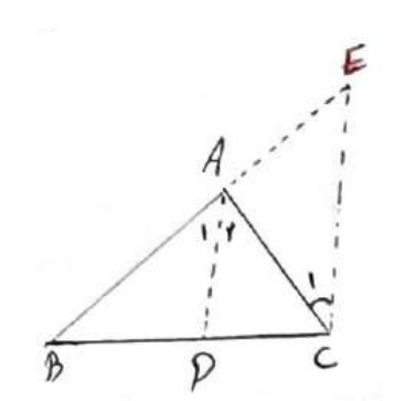 از نقطه C خطی موازی با نیم ساز AD رسم می کنیم تا امتداد AB را در E قطع کند.