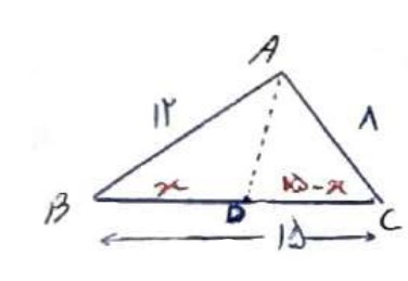 \(\begin{array}{l}\frac{{BD}}{{DC}} = \frac{{AB}}{{AC}} = \frac{{12}}{8}\\\\\frac{x}{{15 - x}} = \frac{3}{2} \Rightarrow 2x = 45 - 3x\\\\ \Rightarrow 5x = 45 \Rightarrow x = 9\\\\ \Rightarrow BD = 9\;,\;CD = 6\end{array}\)