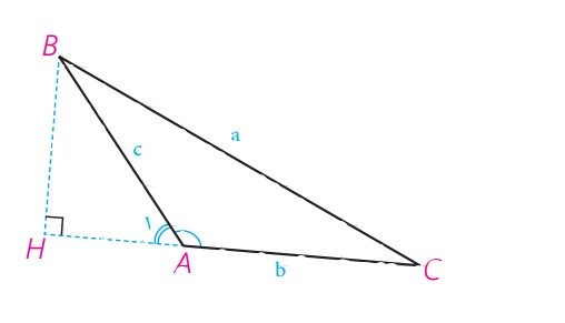 \(\begin{array}{l}{A_1} = 180 - A\\\\ \Rightarrow {\mathop{\rm Sin}\nolimits} {A_1} = {\mathop{\rm Sin}\nolimits} \left( {180 - A} \right) = {\mathop{\rm Sin}\nolimits} A\\\\ \Rightarrow {\mathop{\rm Cos}\nolimits} {A_1} = {\mathop{\rm Cos}\nolimits} \left( {180 - A} \right) = - {\mathop{\rm Cos}\nolimits} A\\\\{\mathop{\rm Cos}\nolimits} {A_1} = \frac{{AH}}{C} \Rightarrow AH = c \times {\mathop{\rm Cos}\nolimits} {A_1}\\\\ \Rightarrow AH = - c \times {\mathop{\rm Cos}\nolimits} A\\\\ \Rightarrow CH = b - c{\mathop{\rm Cos}\nolimits} A\\\\ \Rightarrow BH = c \times {\mathop{\rm Sin}\nolimits} A\\\\B{C^2} = B{H^2} + C{H^2}\\\\{a^2} = {\left( {C{\mathop{\rm Sin}\nolimits} A} \right)^2} + {\left( {b - c{\mathop{\rm Cos}\nolimits} A} \right)^2}\\\\{a^2} = {c^2}{{\mathop{\rm Sin}\nolimits} ^2}A + {b^2} - 2bc{\mathop{\rm Cos}\nolimits} A + {c^2}{{\mathop{\rm Cos}\nolimits} ^2}A\\\\{a^2} = {c^2}\left( {{{{\mathop{\rm Sin}\nolimits} }^2}A + {{{\mathop{\rm Cos}\nolimits} }^2}A} \right) + {b^2} - 2bc{\mathop{\rm Cos}\nolimits} A\\\\ \Rightarrow {a^2} = {c^2} + {b^2} - 2bc{\mathop{\rm Cos}\nolimits} A\end{array}\)
