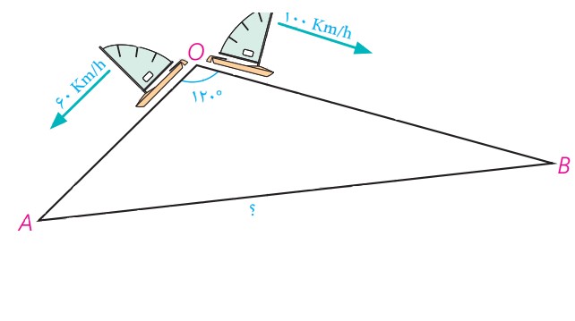 دو قایق از یک نقطه در دریاچه ای با سرعت های \(60km/h\) و \(100km/h\) و با زاویه \({120^0}\) از هم دور می شوند. نیم ساعت بعد دو قایق در چه فاصله ای از یکدیگر هستند؟