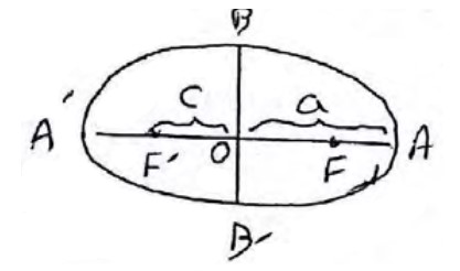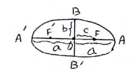 2) \(AA' = 2a\) را قطر بزرگی بیضی و \(BB' = 2b\) را قطر کوچک بیضی نامیده که همان دو محور تقارن بیضی است و محل برخورد آنها یعنی O را مرکز بیضی می نامند که همان مرکز تقارن بیضی است.